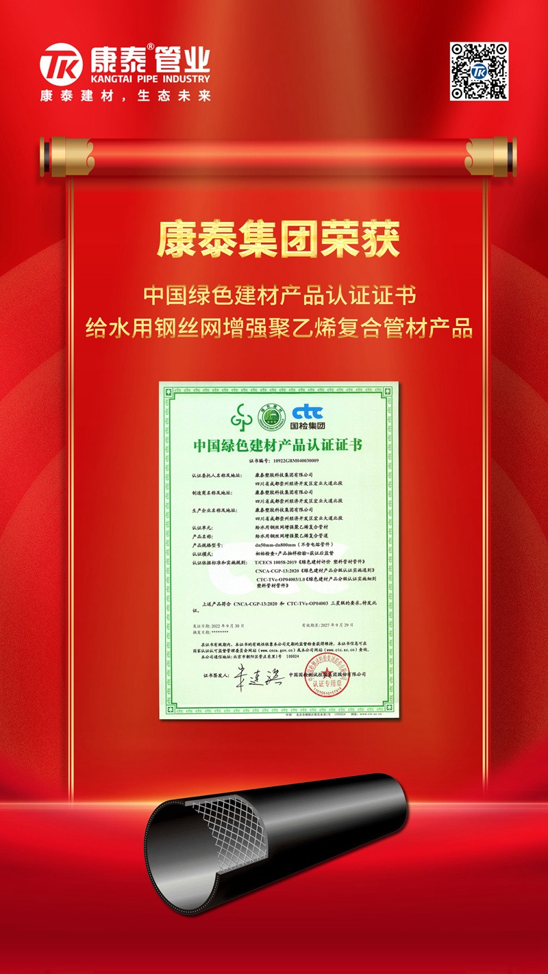 近日,康泰塑膠的給水用聚乙烯(PE)管材、管件產(chǎn)品,燃氣用埋地聚乙烯(PE)管材、管件產(chǎn)品,冷熱水用聚丙烯(PPR)管材、管件產(chǎn)品,埋地用聚乙烯(PE)雙壁波紋管材產(chǎn)品,冷熱水用耐熱聚乙烯(PE-RT)管材產(chǎn)品,給水用鋼絲網(wǎng)增強聚乙烯復合管材產(chǎn)品順利中國國檢測試控股集團股份有限公司認證審核,獲得中國綠色產(chǎn)品認證證書。充分展現(xiàn)了康泰塑膠獲證產(chǎn)品在多種綠色屬性和考核指標的硬核實力。